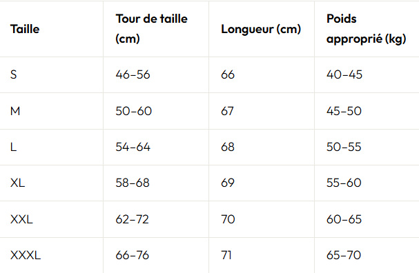 | Taille | Tour de taille (cm) | Longueur (cm) | Poids approprié (kg) |