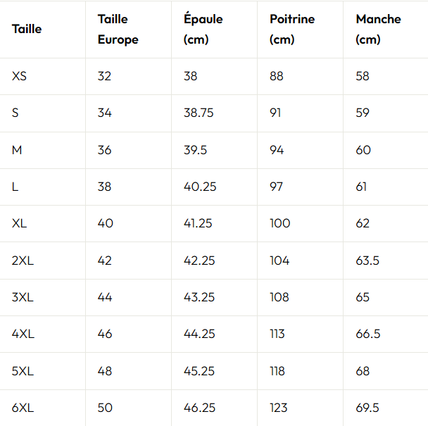 Taille | Taille Europe | Épaule (cm) | Poitrine (cm) | Manche (cm) |